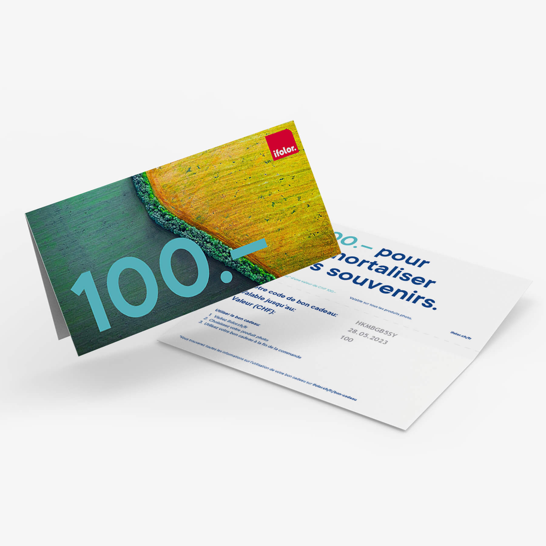Commandez le Bon cadeau ifolor au montant de 20, 50 ou 100 et offrez-le à vos proches. Si la valeur du bon cadeau ne suffit pas à couvrir le montant de la commande, il est possible de choisir l’un des autres modes de paiement que nous proposons pour régler la différence. Le bénéficiaire puisse effectuer plusieurs commandes.