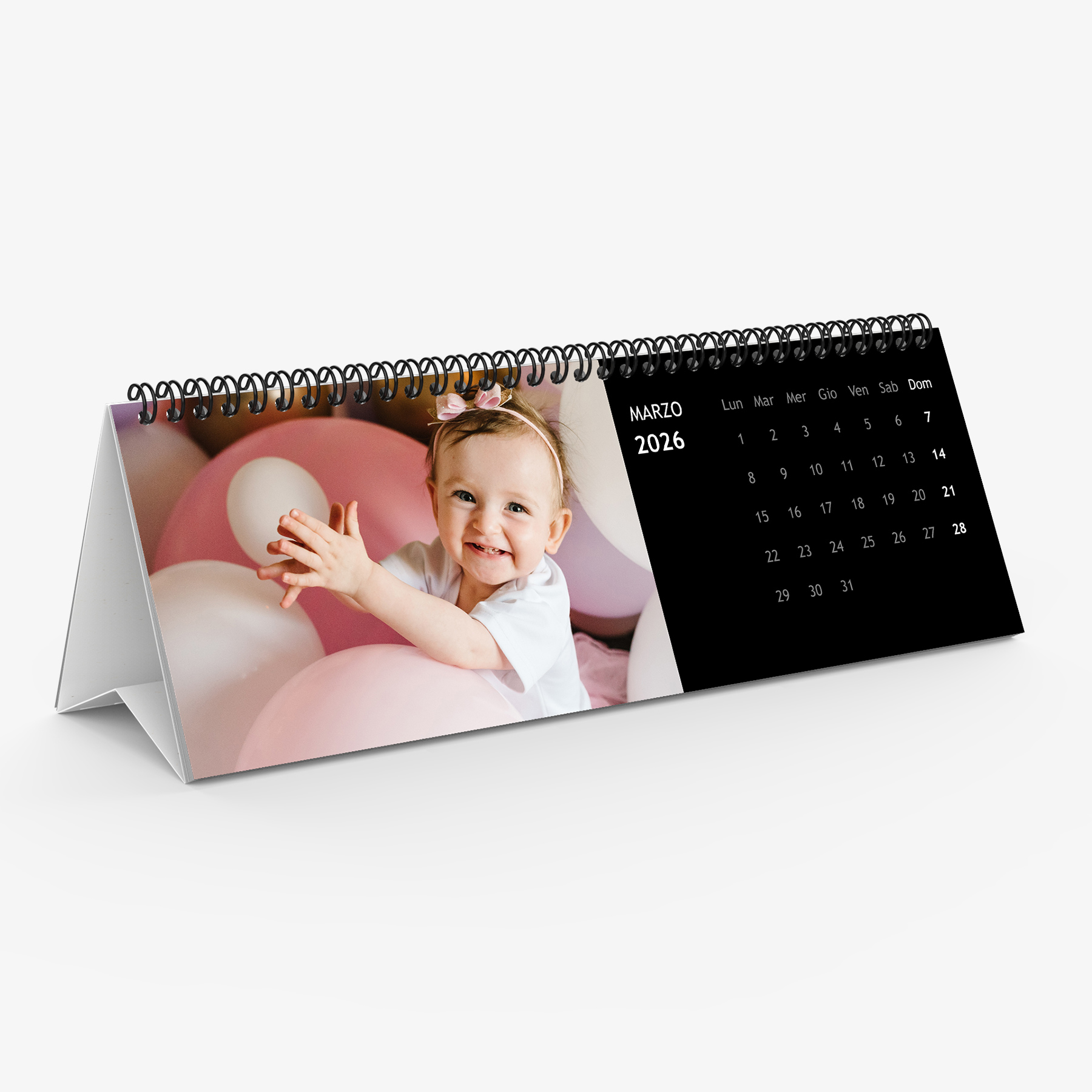 Durante la progettazione del tuo calendario da tavolo, puoi scegliere tra le pagine con finitura opaca o extra lucida. La robusta carta da 250 g / m² viene stampata con un processo di stampa digitale di alta qualità che garantisce una perfetta qualità di immagine. Oltre alla carta resistente, la robusta rilegatura a spirale dona una maggiore stabilità al calendario da tavolo.