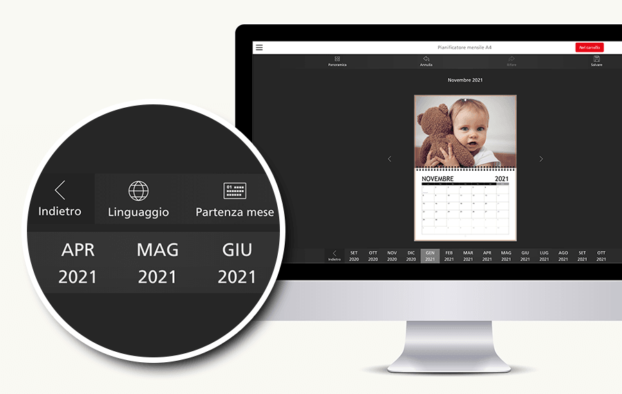 Il nuovo anno è già iniziato? Nessun problema! Con il pianificatore mensile puoi scegliere liberamente il mese di inizio. Basta impostare il mese di partenza desiderato durante la progettazione, inserire le tue foto e il tuo calendario mensile è pronto!