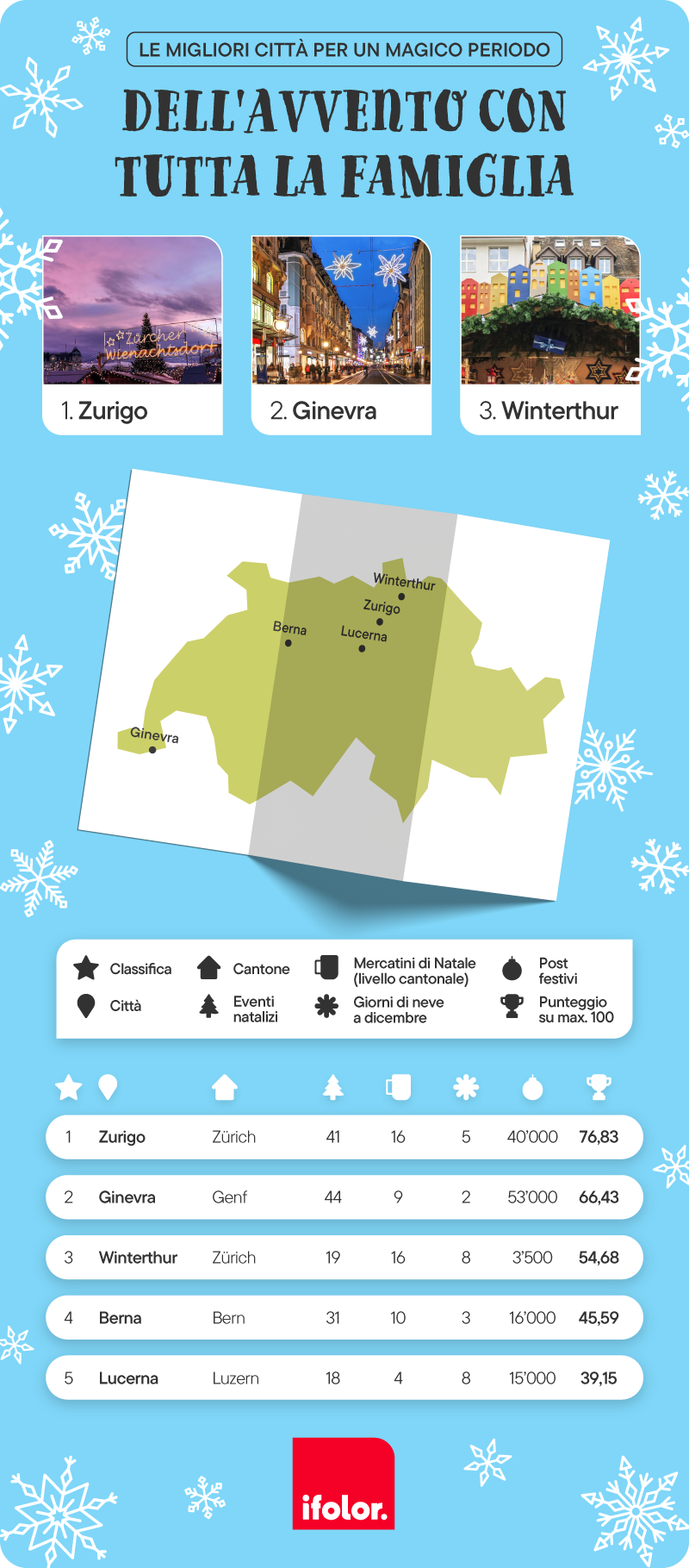 Abbiamo analizzato circa 20 città svizzere in base a diversi criteri festivi: il numero di eventi e mercatini di Natale, le probabilità di neve a dicembre e i post sui social media legati all'Avvento e al Natale. I risultati sono stati trasformati in un punteggio da 0 a 100 per consigliarti i migliori luoghi dove trascorrere il periodo natalizio con la famiglia!