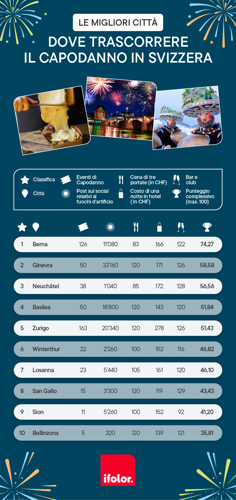 La classifica si basa su dati concreti tra cui il numero di eventi, la popolarità di ciascuna città sui social, il costo medio di una cena per due persone ed il costo di una notte in hotel il 31 dicembre. Berna si aggiudica il primo posto, ma anche Ginevra, Neuchâtel e altre città svizzere riservano sorprese uniche. Scopri la meta perfetta in cui trascorrere il capodanno!